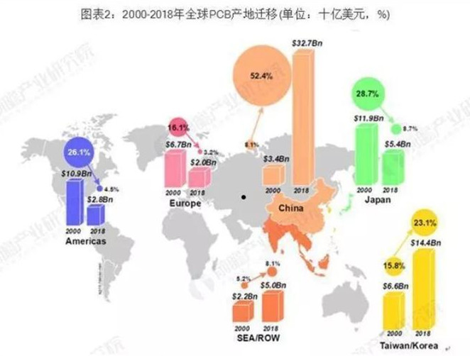 PCB產(chǎn)業(yè)在世界范圍內(nèi)廣泛分布,歐美發(fā)達國家起步早,研發(fā)并充分利用先進的技術設備,故PCB行業(yè)得到了長足發(fā)展。近二十余年,憑借亞洲尤其是中國在勞動力、資源、政策、產(chǎn)業(yè)聚集等方面的優(yōu)勢,全球電子制造業(yè)產(chǎn)能向中國、中國臺灣和韓國等亞洲地區(qū)進行轉(zhuǎn)移。