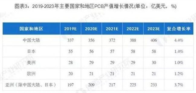 據(jù)Prismark預測,未來5年亞洲將繼續(xù)主導全球PCB市場的發(fā)展,而中國的核心地位更加穩(wěn)固,中國大陸地區(qū)PCB行業(yè)將保持4.4%的復合增長率,至2023年行業(yè)總產(chǎn)值將達到405.56億美元。在PCB公司"大型化、集中化"趨勢下,已較早確立領先優(yōu)勢的大型PCB公司將在未來全球市場競爭中取得較大優(yōu)勢。