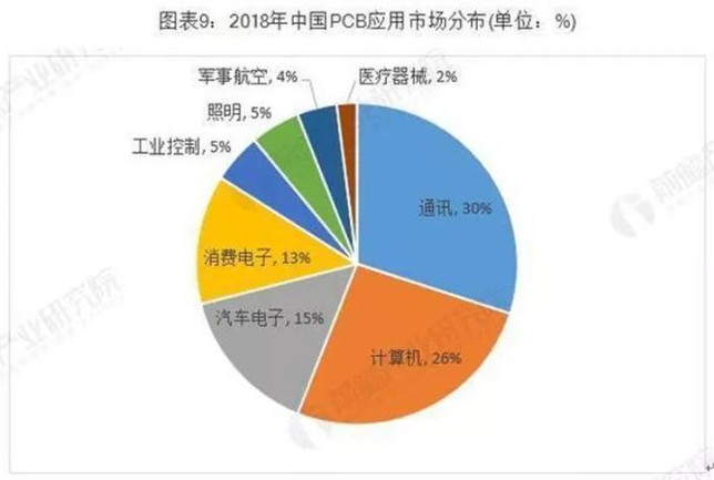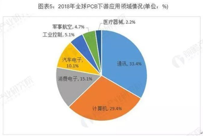 電子信息產(chǎn)業(yè)的蓬勃發(fā)展是PCB行業(yè)發(fā)展的重要助力。從下游應用領域分布來看,2018年通訊行業(yè)的PCB市場規(guī)模最大,占比約為33.4%;其次是計算機行業(yè),占比約為29.4%。其他領域PCB市場規(guī)模較大的是消費電子、汽車電子。